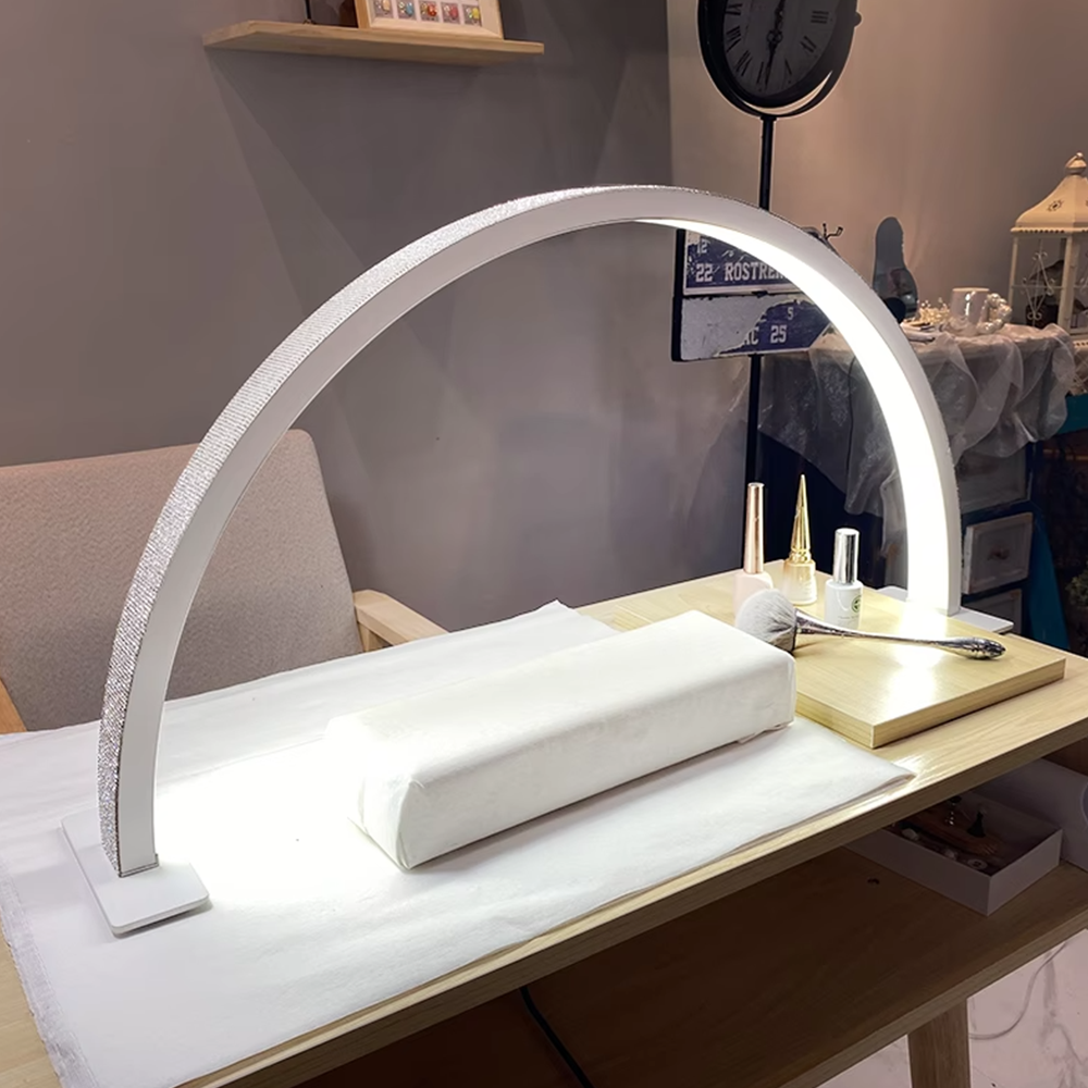 Világítsa meg munkáját stílusosan! Ez a 75 cm széles, félköríves „Holdlámpa” árnyékmentes, professzionális fényviszonyokat teremt minden körömasztalon. A beépített LED-ek színhőmérséklete és fényereje állítható, a strasszköves díszítés pedig igazi prémium eleganciát kölcsönöz szalonjának. A tökéletes fotók és precíz munka elengedhetetlen eszköze!
